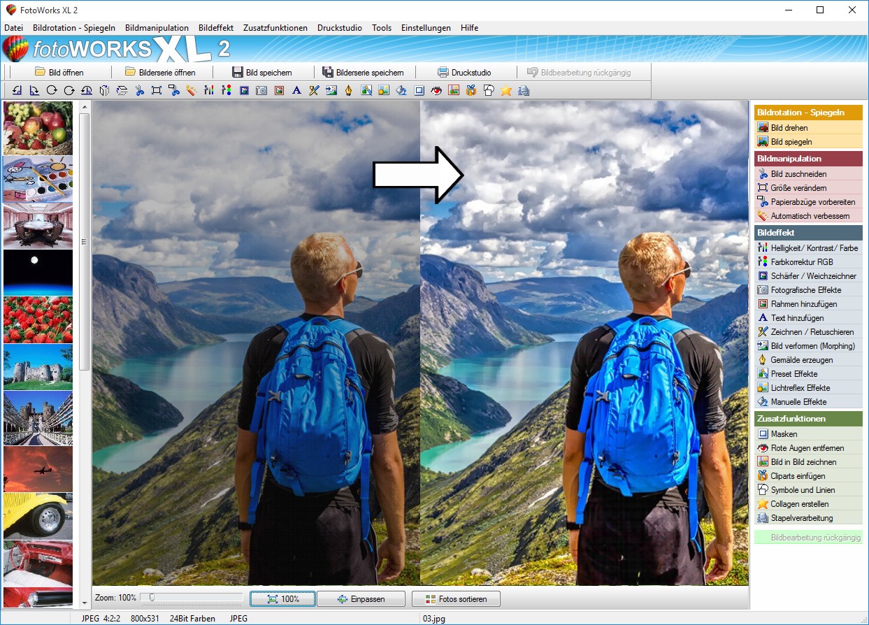 Das intuitive, leichte Fotobearbeitungsprogramm entworfen für unerfahrene User und Profis hat Effekte wie zum Beispiel Foto Cliparts und Bild Schräge. Die Seite Bildbearbeitungsprogramm für Windows 11Sie sind begeisterter Fotograf und haben zahlreiche atemberaubende Fotos vom Urlaub geknipst und wollen nun gerne schnell und professionell viele Ihrer Bilder retuschieren und kreativ bearbeiten? Hier haben wir das deutsche Fotobearbeitungsprogramm für diese Aufgabe. Mit diesem neuartigen Programm für Fotobearbeitung ist es für Einsteiger, aber auch Profis simpel Ihre einzigartigen Fotografien zu verarbeiten.